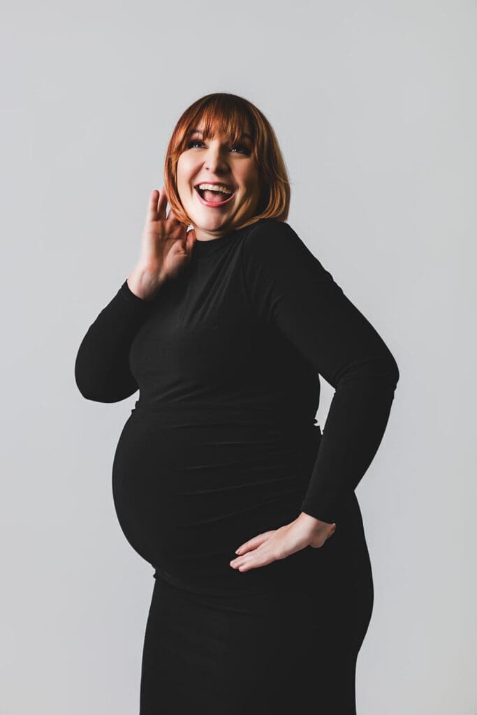 Your maternity photographer will usually allow for some outfit changes in your maternity session if you’re meeting indoors or at a studio. In my hour studio sessions, we normally do around 3 outfit changes: maternity gown, casual outfit, and a stunning silk toss outfit. I also work with my clients to adjust the session according to the style that they prefer (this is why planning ahead together is so important.)